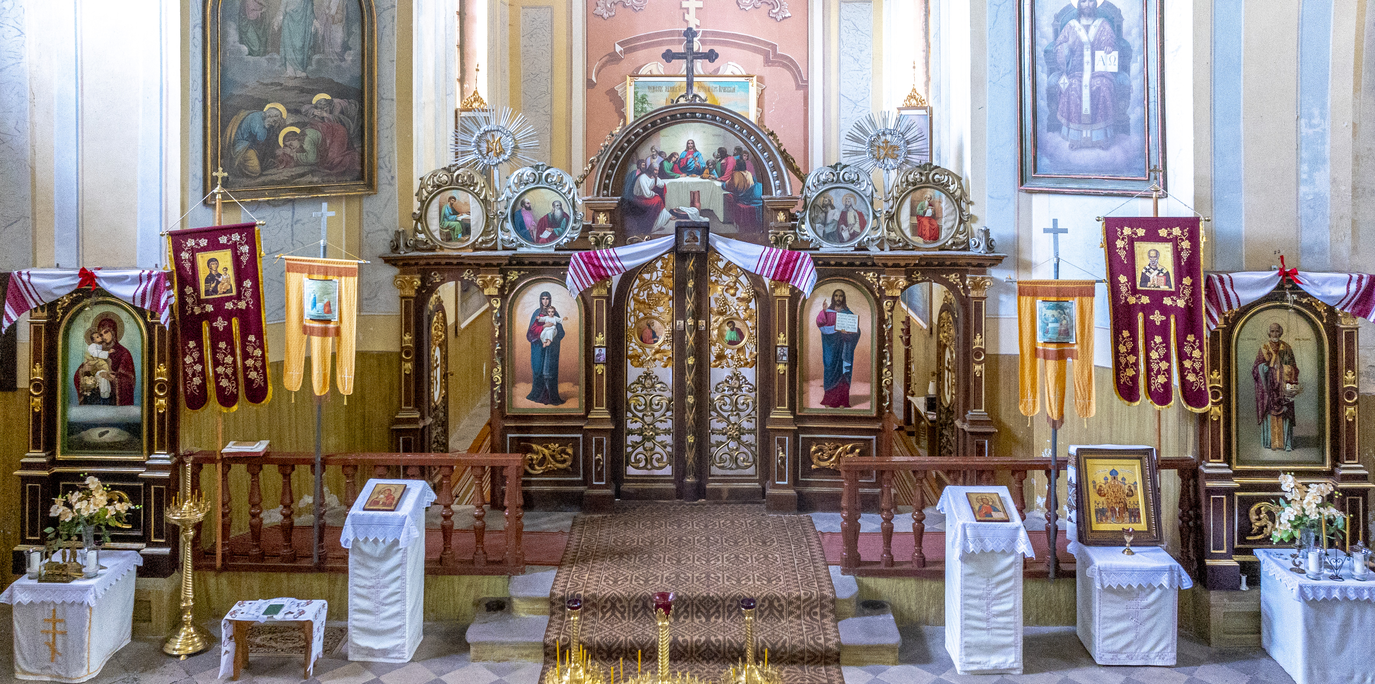 Wszystkie ikony znajdujące się w świątyni są kopiami, gdyż świątynia była wielokrotnie okradana. Powstały one w Turkowicach. Niezachowany pierwszy ikonostas cerkwi powstał w pracowni Sikorskiego w Petersburgu. Ikonostas umieszczony w świątyni po II wojnie światowej jest dwurzędowy. W dolnym rzędzie znajdują się ikony Matki Bożej oraz Chrystusa, w górnym – postacie Ewangelistów oraz świętych Piotra i Pawła, jak również scena Ostatniej Wieczerzy. Nad carskimi wrotami znajduje się niewielka ikona Matki Bożej.